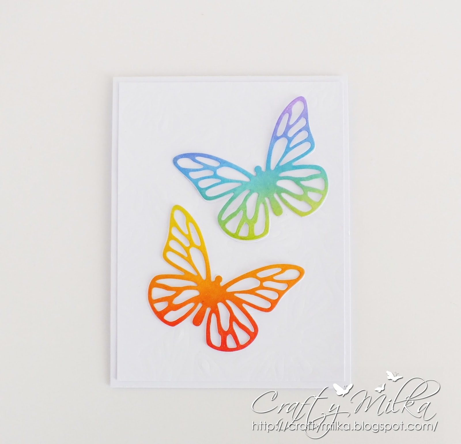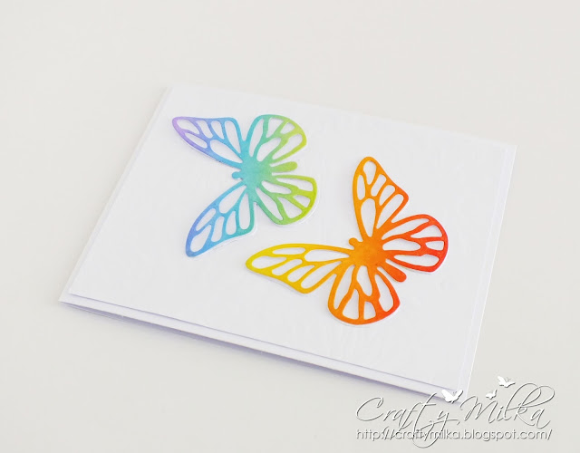 I blended Distress Ink colors on a white cardstock paper panel, following a rainbow pattern, and die cut some pretty butterflies. I used butterfly's inserts for my yesterday's card (find it here) and butterfly outlines for today's card. :o)