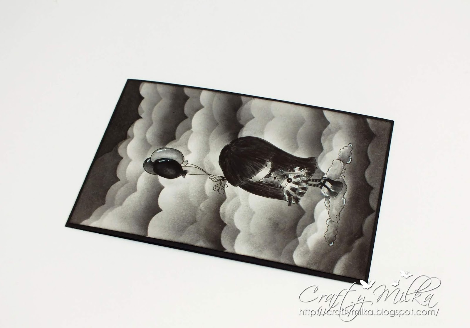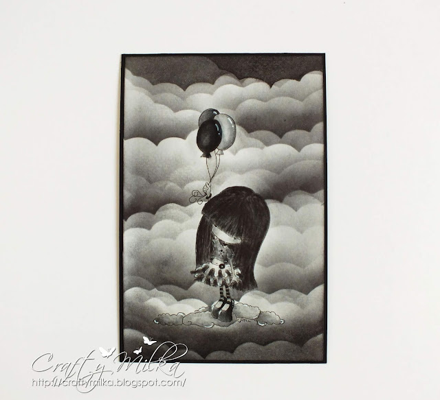 I stamped tiny circles around panda's eyes and colored his eyes with black fine liners. I colored the panda in watercolor technique using Distress Ink Hickory Smoke, just to add a bit of a shade. After drying, I fussy cut the panda and traced edges with black marker. Then I drew highlights with white pigment ink and left the panda aside.