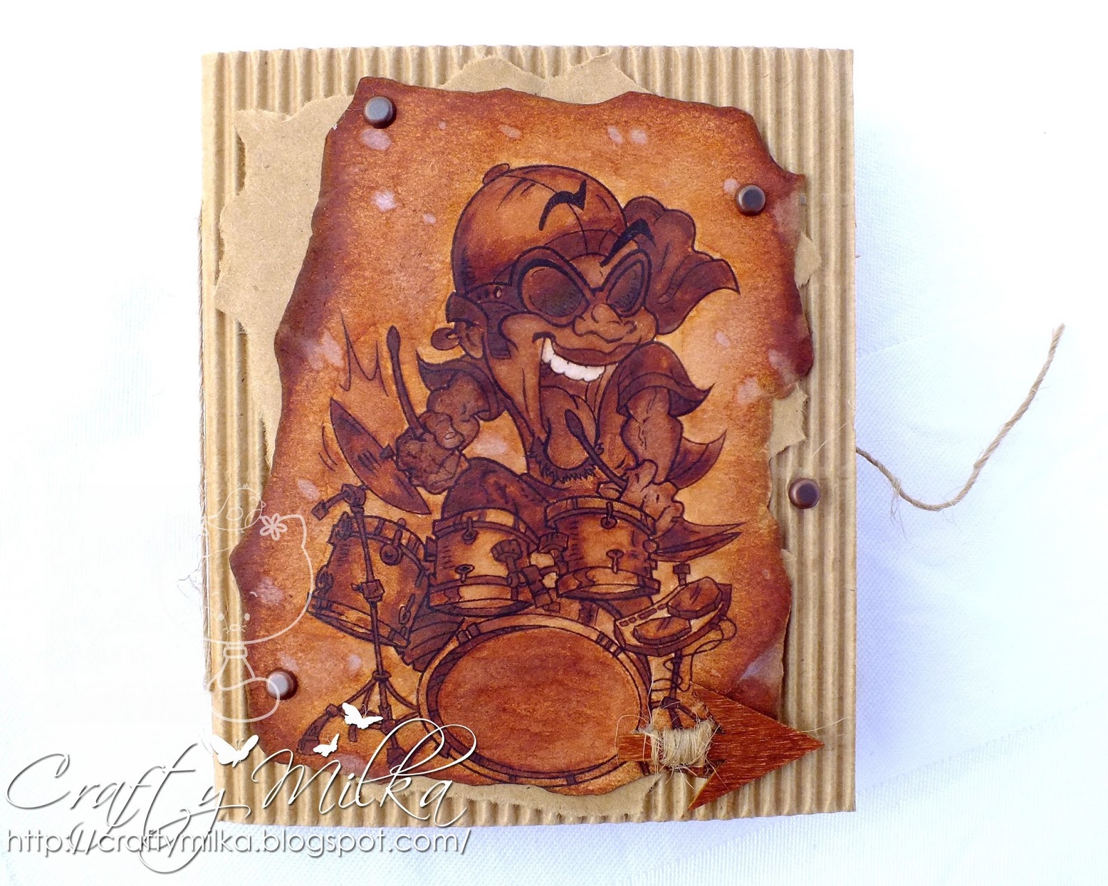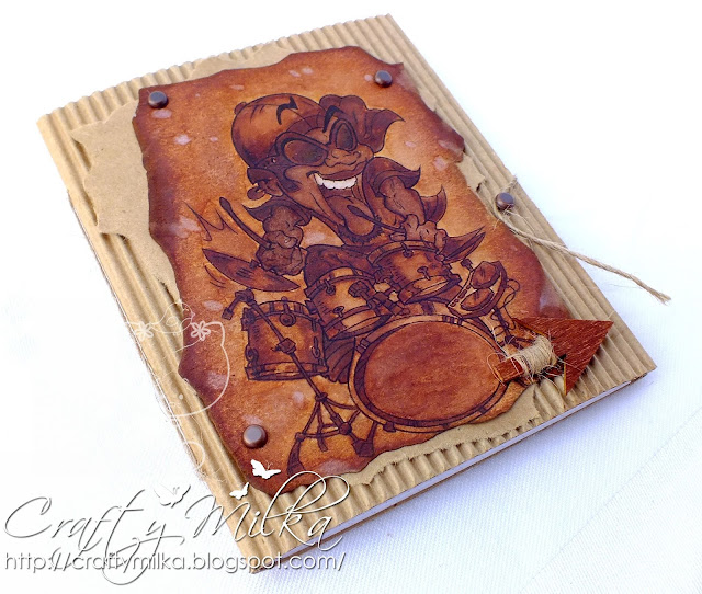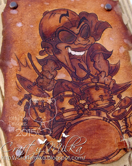 Then I stamped the sentiment and another squirrel on a white cardstock paper panel and colored the squirrel in black. I softened the watercolored squirrel with a stylus ball on a soft working mat and glued her over the black one. Then I stamped music notes on the panel, as the squirrel is singing Happy Birthday to her. :o)