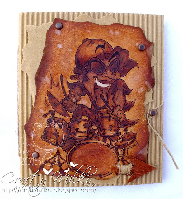I stamped a squirrel on a watercolor paper and colored her in watercolor technique using Distress Inks. After drying, I fussy cut the squirrel and traced edges with black marker.